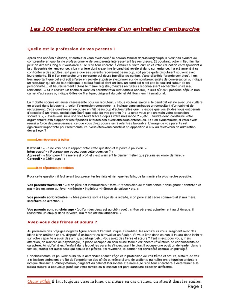 100 Questions Entretien Embauche Pdf Cinematographie Recherche D Emploi